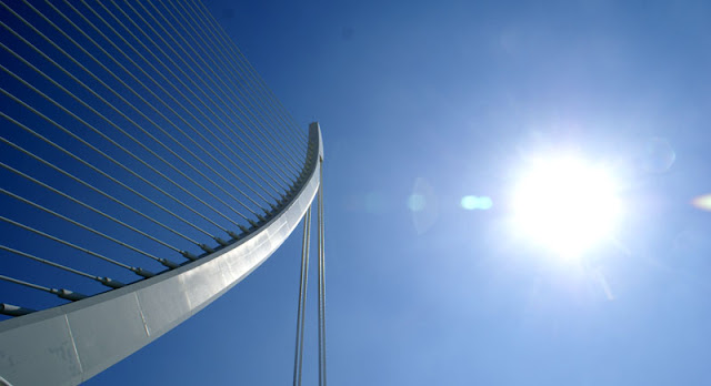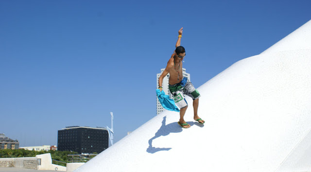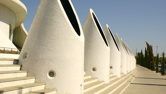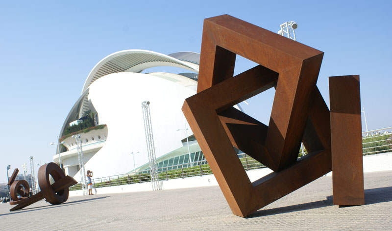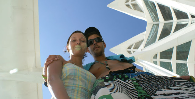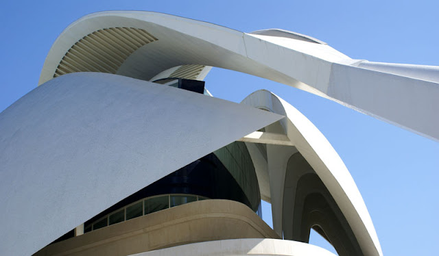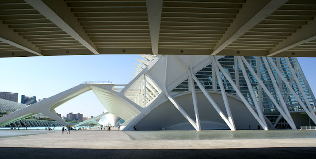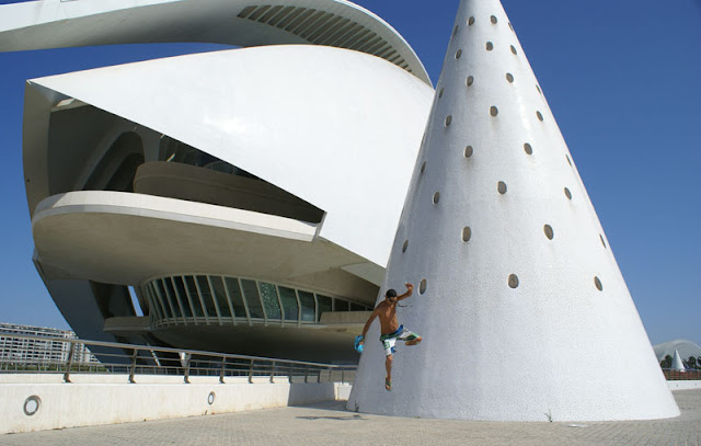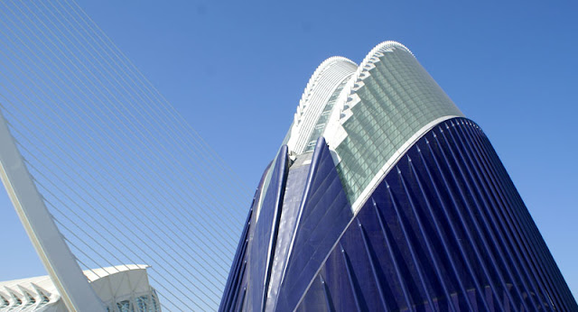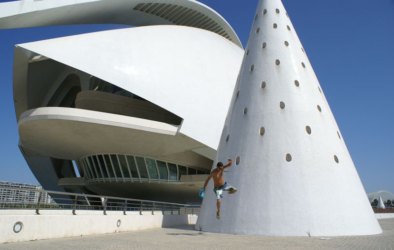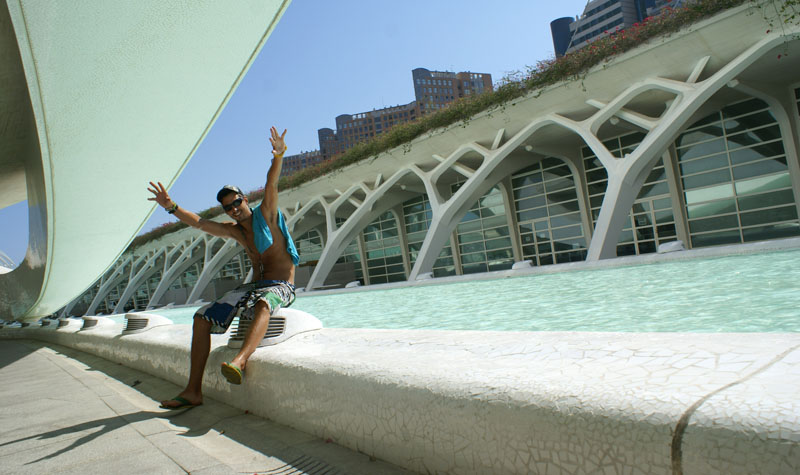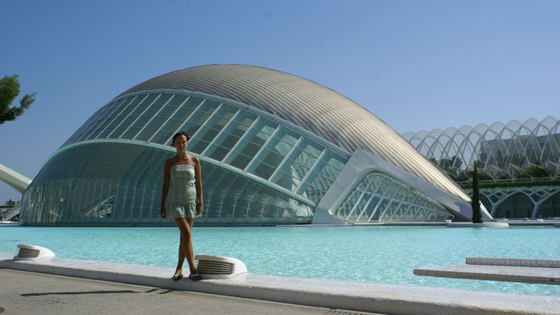 ZE względu na duże ubytki w kieszeniach postanowilismy przemieszczać się drogami niepłatnymi. Minęliśmy Castello de la Plana, aż w końcu dotarliśmy do Walencji. Trafiliśmy tam na nowoczesny kompleks budynków, który wcześniej obraliśmy sobie za cel. Całość mieści się w dawnym korycie rzeki Turia, jednak bliżej portu. Budynki te składają się na miasteczko sztuki i nauki (La Ciutat De Les Arts i De Les Cientes) naprawdę zrobiło na nas wrażenie swoimi futurystycznymi formami. Czuś, że arvhitekt ( Santiago Calatrava) nawiązywał do nadmorskiego klimatu miasta. Budynki przypominały formą ogromne statki, muszle czy fale. Przechadzając się pomiędzy nimi można zanużyć nogę w sadzawkach wyłożonych ceramiką i napełnionych błękitną wodą. To wszystko tworzyło naprawdę niesamowity efekt. Tafla wody odbijała się w bieli budynków – cudo. Jeśli ktoś kiedyś wybiera się do Walencji to koniecznie musi to zobaczyć. Niestety nie zdążyliśmy juz na targ żywności, który podobno jest jednym z największych w europie.