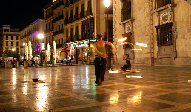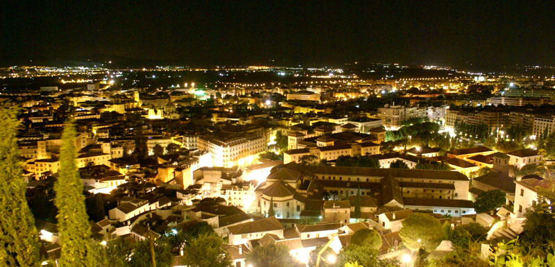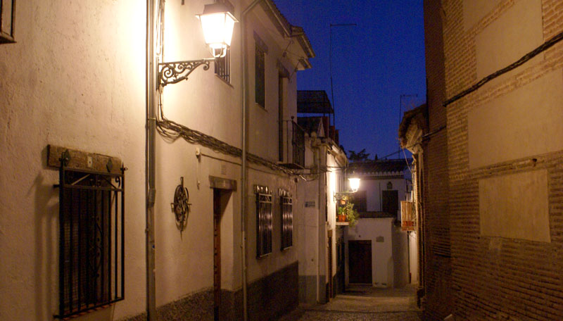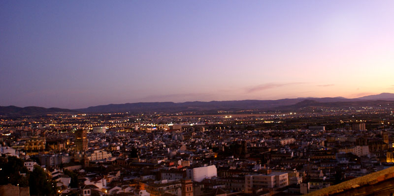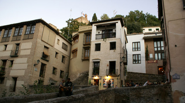 Wyskoczyliśmy z samochodu i ruszyliśmy na wieczorną przechadzkę po Granadzie. Zaczęliśmy od dzielnicy na wzgórzu Albaicin, czyli najstarszej części miasta. Znależliśmy się w typowej andaluzyjskiej plątaninie uliczek.Wszędzie bielone wapnem domki, bruk, a z każdego kąta słychać było muzykę. Trafiliśmy do jakiejś knajpki, gdzie dwóch Amigos z gitarrrrrami dawali ujście swym hiszpańskim korzeniom. Na innej z uliczek usłyszeliśmy rzewny, chwytający za serce śpiew przy akompaniamencie skrzypiec. Klimat naprawdę bajkowy. Tak naprawdę dopiero teraz zaczęlismy czuć Hiszpanię.