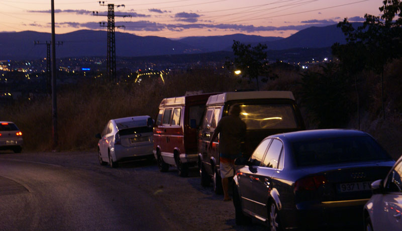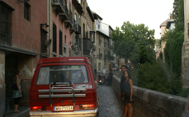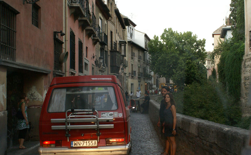 Dalej ruszyliśmy w kierunku Granady. Już mieliśmy ją omijać, kiedy coś mnie podkusiło, żeby trochę poczytać o tym mieście. Dowiedziałam się że:” Nie ma w życiu większego cierpienia niż oślepnąć w Granadzie”. Szybko zmienilismy kierunek i pod wieczór już tam bylismy. Nasz wjazd do miasta był bardzo widowiskowy, bo wbiliśmy się na brukowany deptak, który był tak ciasny, że ledno jeden samochód się zmieścił.W międzyczasie zorientowaliśmy się, że jedziemy w konwoju ślubnym :).
