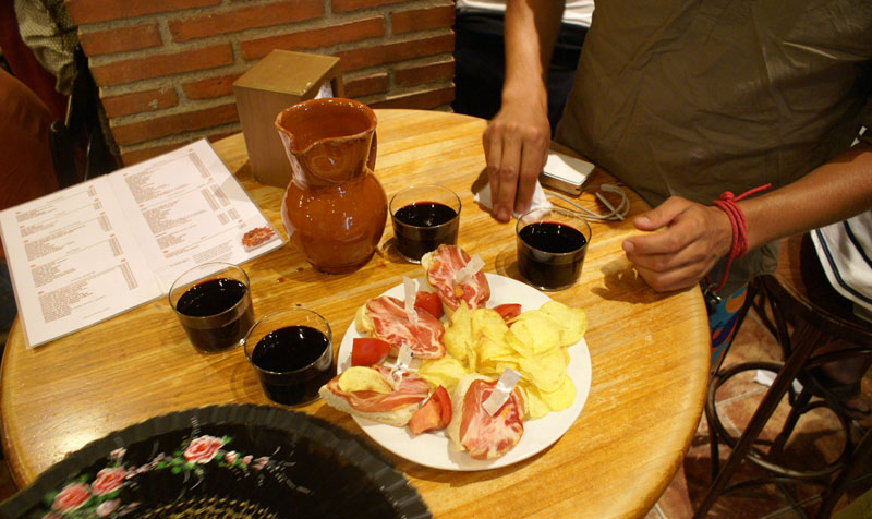 Zrobiliśmy się głodni, więc zaczęliśmy szukać uprawgnionych tapasików. Obskoczyliśmy dwie knajpeczki. W pierwszej było grane anchouis i coś co nie wiadomo czym było, ale było dobre oraz Sangrie z pomarańczką. W kolejnej zamówiliśmy tależ mięs i dzbanek wina z beczki. Najedzeni ruszyliśmy dalej i tym razem dotarliśmy do dawniej cygańskiej dzielnicy, gdzie planowaliśmy zobaczyć pokaz flamenco ( i to akurat się nie udało, bo wszędzie full zainteresowanych ).