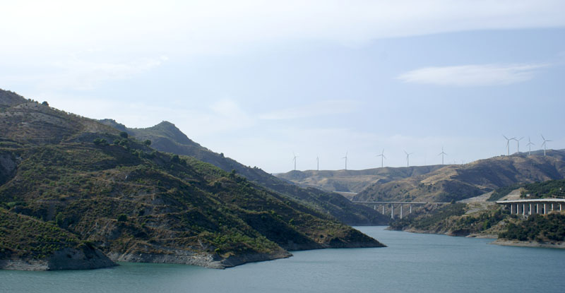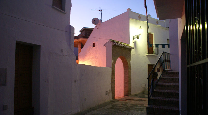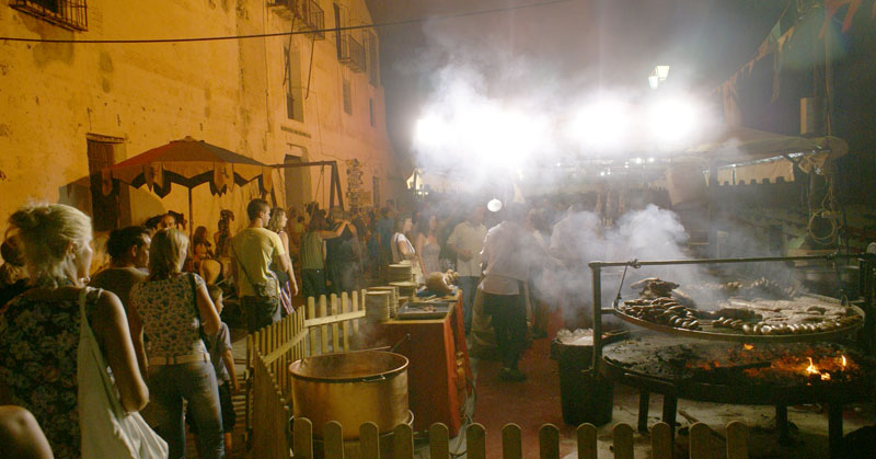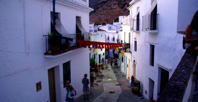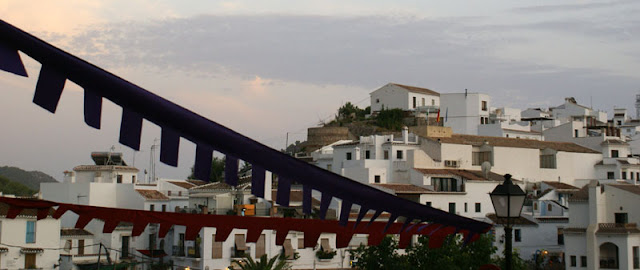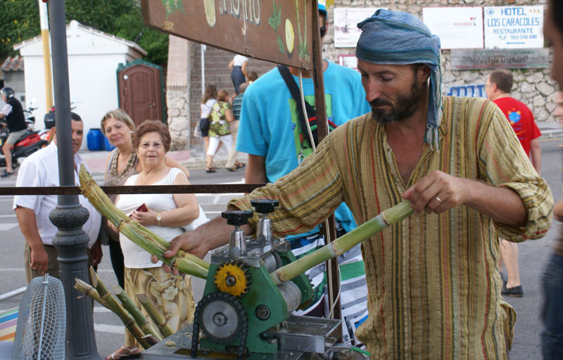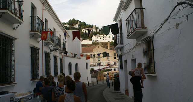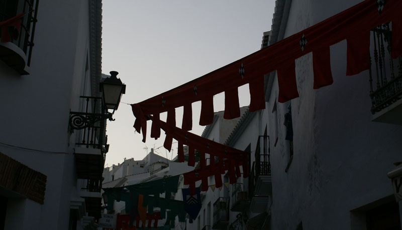 Dalej ruszyliśmy do Frigiliany, jednego z tzw. białych miasteczek jakich wiele w tym regionie. Mieliśmy akurat szczęście, że trafiliśmy na festiwal 3 kultur, który się tam odbywał. Po okrążeniu pięć razy tego samego ronda i parę razy wjeżdzając w te same uliczki wreszie udało nam się gdzieś zaparkować. Całe miasteczko ozdobione zostało kolorowymi flagami, a podczas spaceru mijaliśmy specjalnie na tę okazję stworzone barki tapas. Nie omieszkaliśmy z nich skorzystać. Na placu głównym odbywały się koncerty i targowiska – kiczowiska jakich wiele przy takich okazjach. Można było też pojeść mięsko z wielkiego grilla, napić się soku ze świerzo wyciśniętego bambusa i zagryźć wielkim ciachem.