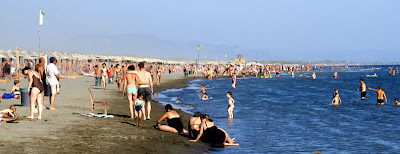My chwilke ochlonelismy i poszlismy na plazyne zaladowani reczniczkami, aparatami, czapeczkami itd. Wskakujemy na plaze a tu? Jakis las cholerny, ale parasolek. Jedna przy drugiej az po horyzont. Faktycznie plaza szeroka i dluga na 13 km, ale to 13 km parasolek. Co najlepsze jeszcze jakies loze dla VIPOW, ktore wygladaly jak male domki z przescieradel. Gdzieniegdzie tez stoly z pilkarzykami i stragany z owocami.