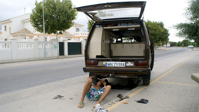 Czas umyka, a my już musimy zmykac z wybrzeża. Rano Michał nakarmił jakiegoś żuka bułką i nutellą, bo się błąkał głodny. Wyspani poszlismy jeszcze pożegnać się z wybrzeżem, gdzie zachwycił nas niesamowicie duży odpływ, który odsłonił kawał rafy. W poszukiwaniu wrażeń połazilismy po niej chwilkę, porobiliśmy parę zdjęć. Potem nadszedł czas szykowania samochodu do niekrótkiej podróży w kierunku Polski (3500 km). Michał musiał oklepać silnik młotkiem, żeby olej nie wyciekał :). Jeszcze wypiliśmy małą kawkę i dalej w drogę przez Sewillę. Na spanie zatrzymaliśmy się kawałek przed Caceres. Jutro kolejne kilometry nas czekają, więc połozylismy się grzecznie wcześnie spać.