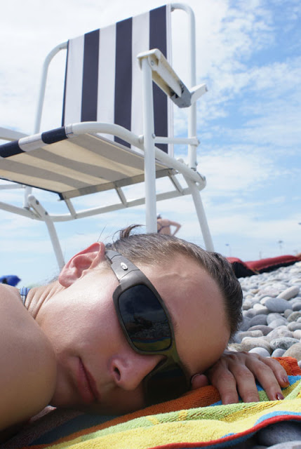 Krętymi uliczkami poruszaliśmy się wzdłuż wybrzeża w kierunku St.Tropez. Zatrzymaliśmy się w małej zatoczce gdzieś w okolicach St. Raphael. Zeszliśmy ze skarpy na malutką plażyczkę z uroczymi skałkami. Posiedzieliśmy troszkę, sunshower i spać. W międzyczasie okazało się, że Karo i Kuba mają zepsutą kartę do aparatu i niestety nie mają żadnych zdjęć. No cóż – chyba ktoś nam zazdrości podróży :).