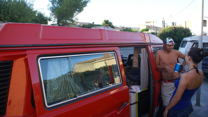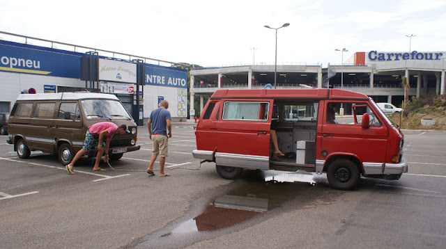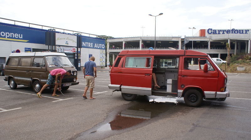Dzień zaczął się dyskusjami co mogło się stać z naszym samochodem. Pomiędzy właczaniem silnika, siedzeniem w pobliskim mc donaldzie w necie, telefonami do Roberta – czołowego mechanika – konsultanta udało nam się wyszukać warsztaty samochodowe w okolicy. Wzięliśmy sprawnego Maliniaka i zaczęliśmy rajd po mieście ( należy dodać, że dzisiaj niedziela :). Na szczęście udało nam się znależć pana skośnookiego, grzebiącego przy łódce. Wystarczyło zagadać ( na szczęście okazało się, że umie gadać po angielsku co we francji jest żadkością ). Scholowaliśmy naszą stukoczącą westkę pod jego bramę i nagle wyległo parę osób ( 3 dokładnie ). Zaczęli nam tłumaczyć, że westka robi „klik klak klik klik klak” i że to twisted le belle – cokolwiek to znaczy. Największym problemem okazało się to, że w niedziele mechanik nieczynny, a i w poniedziałek i to nie tylko świąteczny też nie pracują. Zostało nam przeczekanie do wtorku w LA CIOTAT :P.