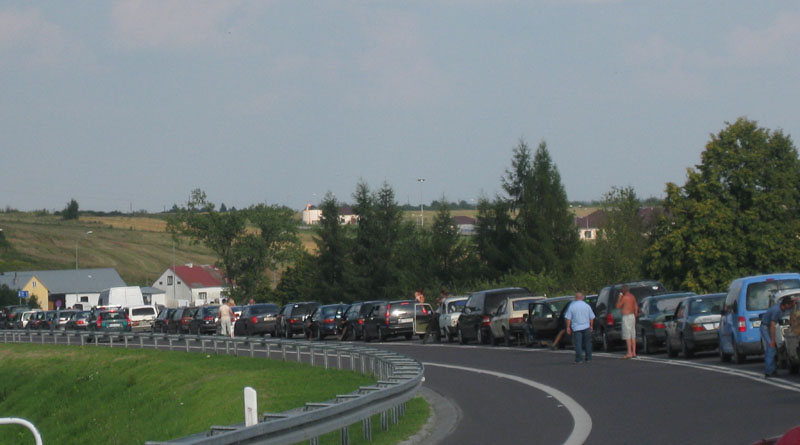 Juz 5 km do granicy, a tu co? Gigantyczny kolejko – korek ……………..koszmar. Gwar jak na bazarze, trabia, przepychaja sie. Samochody do koloru do wyboru poczynajac od legendarnej Wolgi konczac na starych rzechowatych busach. Najdziwniejsze bylo to ze kazdy zaladowany byl lodowka albo pralka, ewentualnie podejrzanym zelastwem.